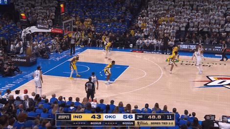 像下面这个回合,亚历山大面对上线施压时不着急传球,反正步行者虽然包夹施压但没人能从亚历山大手里抢走球,亚历山大只要不盲目传球就也不至于失误,他可以一直保持运球、逐渐渗透,直到他渗透到罚球线以下时,步行者的施压防守会被带得缩到很小、外围空档很大,这时亚历山大再传球时就风险小很多。