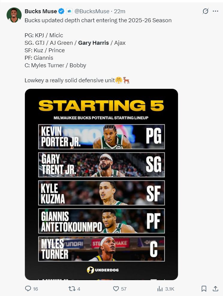 新赛季雄鹿的潜在先发:小波特、特伦特、库兹马、字母哥、特纳,攻防的硬实力都还行。